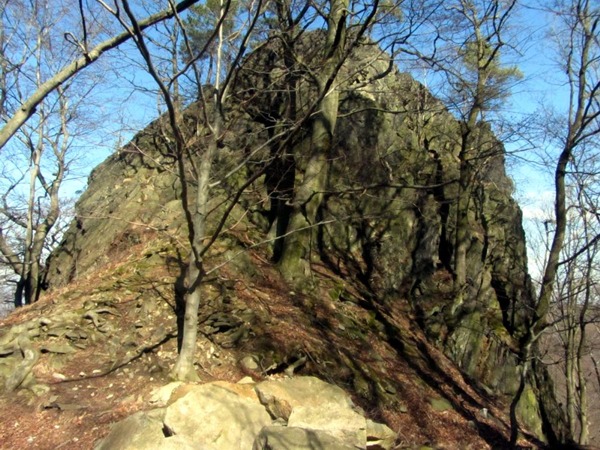 Selbständiger Felsturm (Phonolith) unterhalb des großen Fernsehturms über Ústí und Děčin auf dem Buková hora (Zinkenstein) in Tschechien.
