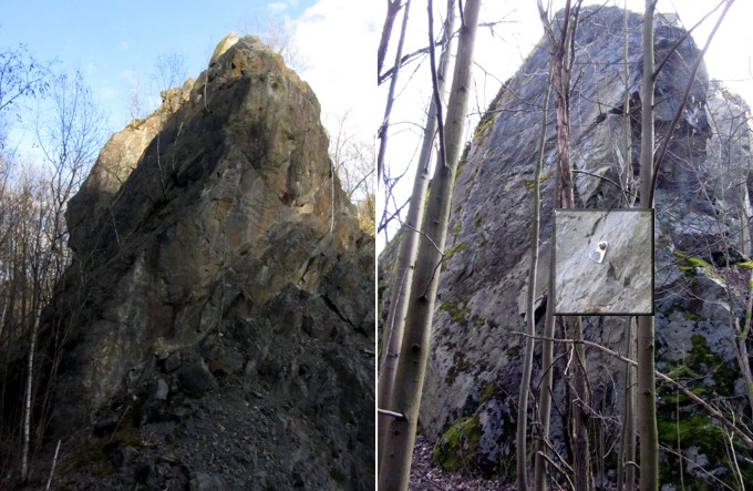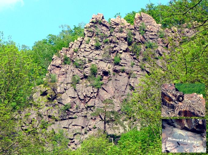 Große rote Quarzit-Wand im Bahretal unterhalb von Friedrichswalde (direkt über der Straße K8757 nach Pirna) mit 3 markanten Gipfelklippen und einigen Kletterwegen in der Talseite (Himmelsleiter, 1. Streich) und auch in der Scharte (Pfefferkuchen).