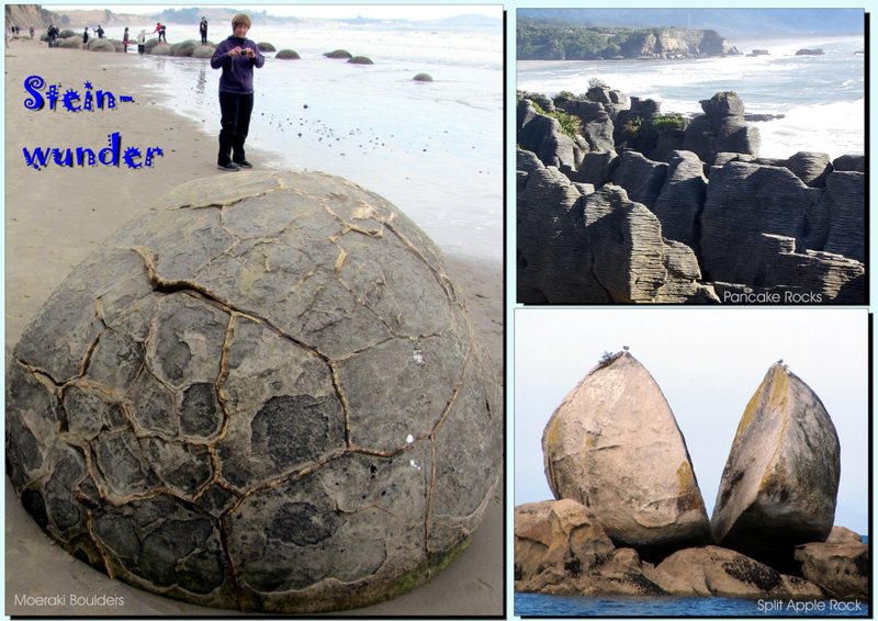 Es ist schwer, die vielen großen Eindrücke zu vergleichen, aber besonders unvergessliche Erlebnisse für uns persönlich waren die menschenleeren, brandungsumtosten Klippen bei Charleston, die Bootsfahrt auf dem sonnendurchfluteten Milford Sound, die Curio Bay mit ihren versteinerten Bäumen + abendlichen Gelbaugen-Pinguin-Beobachtungen, die ehrfürchtige Stimmung am Hooker-See am Fuße des Mt. Cook, die unglaublich vielen gigantischen Baum-Riesen - häufig auch mitten auf den Campingplätzen - , die bizarren Formationen der Clay Cliffs und der Putangirua Pinnacles, die vielen Wasserfälle und Höhlen, die vulkanischen Felder bei Rotorua...