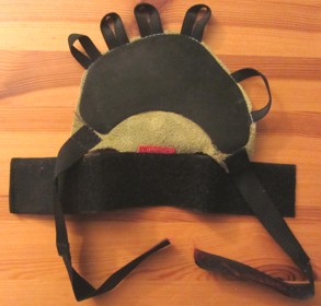 | Inzwischen wurden unsere damaligen Rissleder, meist aus dem Leder abgelegter Kletterschuhe + angenähte Schlaufen und Bänder aus Schnürsenkeln selbst hergestellt, perfektioniert. Tschechische Produzenten bieten Hightec-Erzeugnisse mit Klettverschlüssen und Gummiauflagen auf dem Handrücken an... |