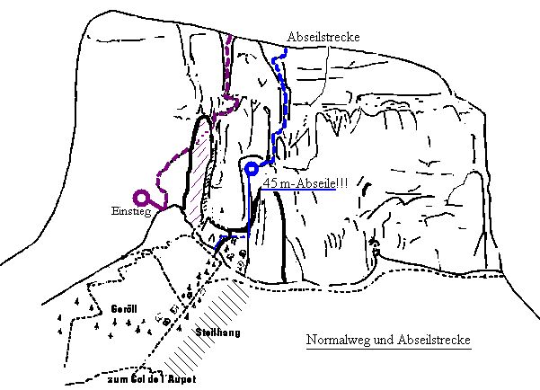 Schlucht hinter Pfeiler. Rechts (H) nochmals 8 m abseilen, dann auf Pfadspuren nach rechts
