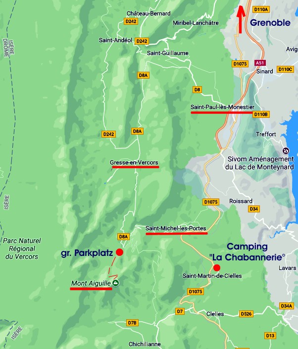 weiter bis zur Abzweigung rechts nach St. Michel les Portes und Les Pellas. Dort an der Spitzkehre (bei einer Brücke) beginnt der Weg in Richtung Sattel Col de l'Aupet. Fährt man noch ca. 300 m auf dieser unbefestigten Straße hinauf, erreicht man einen großen Parkplatz, der wohl für den ein Stück aufwärts eingerichteten Hochseilgarten angelegt wurde (Hinweisschilder empfehlen, dass man keine Wertsachen im Auto lassen sollte).