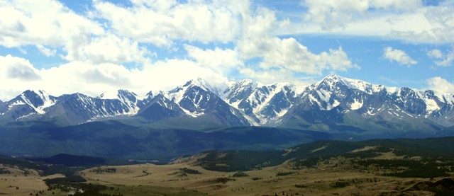 Unsere Route führte vor allem durch Gebirgsteile mit Mittelgebirgs-Charakter. Dass der Altai aber im Süden auch ein stark vergletschertes Hochgebirge mit vielen Gipfeln über 4000m ist, konnten wir von einem spektakulären Aussichtspunkt aus ahnen.