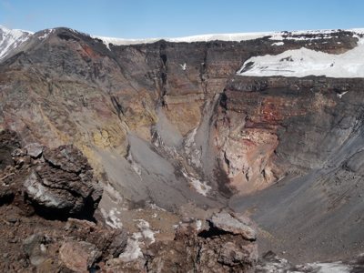 | Überwältigend waren die Eindrücke in der Schönwetter-Woche am Vulkan Ploskij Tolbatschik. Am gigantischen Lavastrom des Ausbruchs von 2012/13 hatte man das Gefühl, das alles sei gerade mal vorgestern passiert, an heißen Stellen dampft es noch, es faucht und riecht nach Schwefel, überall skurrile Formen von Kissen- und Stricklava. Man spürt förmlich hautnah die gewaltigen Naturkräfte, die sich hier ausgetobt haben. Einmalig die Aussicht vom Gipfel!