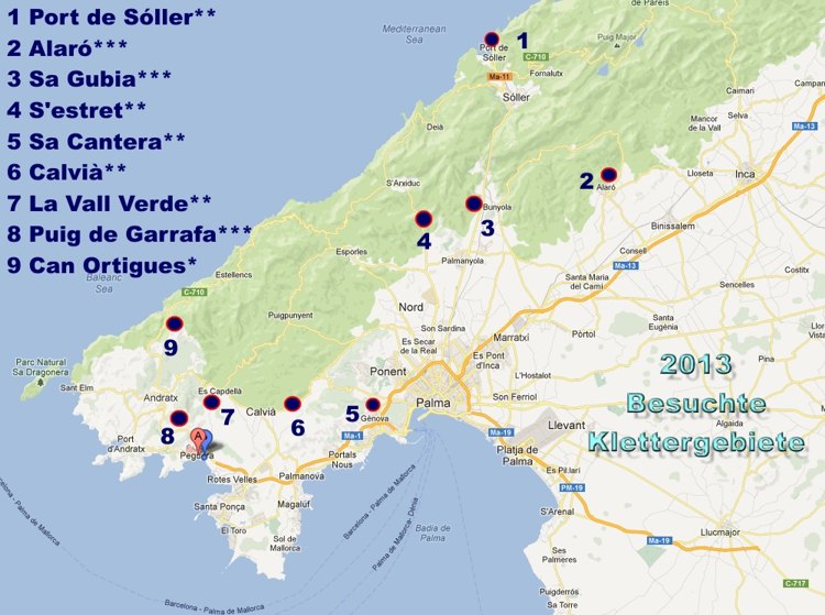 Vom 16.-23.04.2013 zog es uns erneut auf die Balearen-Insel, diesmal in den Südwesten nach Paguera, um dort die in der näheren Umgebung gelegenen Klettergebiete zu besuchen. Höhepunkt für mich war die tolle Mehrseillängen-Kante Albahida in Sa Gubia.