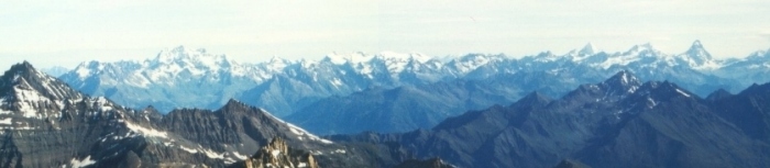Panorama-Aussicht vom Gran Paradiso (v. li. Mt. Blanc, Grand Combin, Weißhorn, Zinalrothorn, Matterhorn)