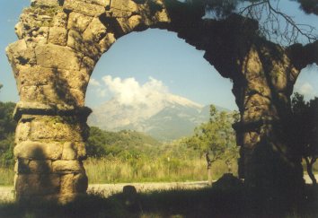 Antiker Aquädukt in Phaselis. Im Hintergrund der noch schneebedeckte Tahtali-Dag (2366 m).