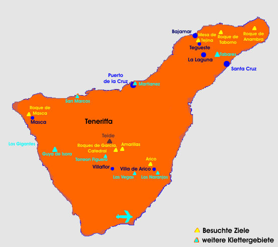 | Tennerifa ist allemal eine Reise wert! Fasziniert hat uns insbesondere die Gegend um den Teide. In dieser gigantischen Vulkan-Landschaft kommt man sich oft so richtig klein vor und kann die Urgewalten der Natur förmlich spüren. Deshalb waren wir auch von den Klettereien in diesem Bereich am meisten begeistert. Die Besteigung der 120 m hohen Kathedrale in den Roques de Garcia als Höhepunkt unserer Reise lieferte unvergessliche Eindrücke, aber auch das Klettern im festen Gestein der Amarillas (Cañada del Capricho) gefiel uns sehr. |