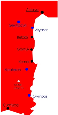 - Das Gebiet um Olympos hat neben einer Vielzahl von (meist schwierigeren) Klettermöglichkeiten auch sonst noch allerhand zu bieten: Einen schönen Strand, eine große Anzahl historischer Ruinen für Geschichts-Interessierte, eine Begegnung mit der Mythologie an den berühmten ewigen Feuern der Chimäre und überhaupt eine reizvolle Umgebung...