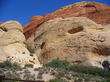 Auch in den Red Rocks bei Las Vegas bevorzugten wir bei unserem Kurzbesuch die Sportklettertouren am Calico-Massiv. Die Stadt selbst wird uns nicht nur wegen der ersehnten 'All you can eat'-Orgie in besonderer Erinnerung bleiben: 2 von uns hatten sich mit in der Hitze des Zeltplatzes verdorbener Wurst eine heftige Lebensmittelvergiftung zugezogen und fühlten sich in Emergency-Fernsehserien versetzt, als sie in die Notaufnahme eines Krankenhauses eingeliefert werden mussten.